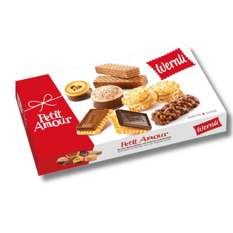 Diese sorgfältig zusammengestellte Auswahl an Petit Amour Biscuits zeigt die vielfältigen und exquisiten Geschmacksrichtungen, die das meisterhafte Schweizer Schokoladen- und Biscuithandwerk der geschätzten Marke Wernli ausmachen.