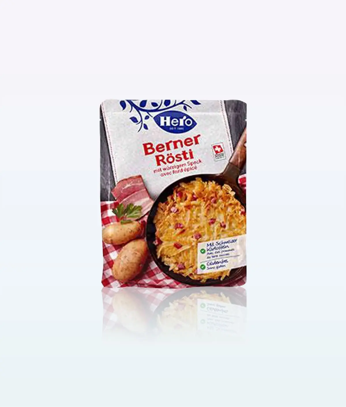 हीरो लंबे समय तक चलने वाले पाउच में तैयार स्विस राष्ट्रीय व्यंजन उपलब्ध कराता है। प्रसिद्ध रोस्टी दुनिया भर में लोकप्रिय है। हीरो इन आलू की खासियतों को बेहतरीन, जैविक रूप से उगाए गए आलुओं से बनाता है। इसके अलावा, इन्हें बनाना भी बेहद आसान है। इन बेहतरीन उत्पादों के साथ हीरो आपको जहाँ भी और जब भी चाहें पारंपरिक स्विस भोजन का आनंद लेने में सक्षम बनाता है।