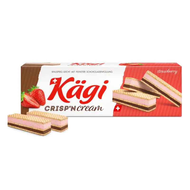 Kaegi Crisp’n Cream Strawberry – crispy Swiss wafers with smooth strawberry mousse filling. Light, creamy, and perfect for sharing or on the go.